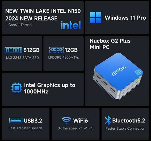 A livello di comparto hardware è da segnalare la presenza del processore Intel N150 con chip grafico Intel UHD Graphics integrato, affiancato da 12 GB di RAM DDR5 e da un’unità SSD M.2 da 512 GB (espandibile fino a 2 TB) per l’archiviazione. Ci sono poi la connettività Wi-Fi 6, Bluetooth e con doppio slot Ethernet, le tre porte USB 2.2 Type-A, una USB-C e tre uscite video con supporto alla risoluzione 4K: due HDMI 2.0 e una DisplayPort 1.4. Volendo è possibile utilizzarlo anche con Ubuntu e altre distribuzioni Linux. Dai uno sguardo alla scheda del prodotto per altre informazioni.