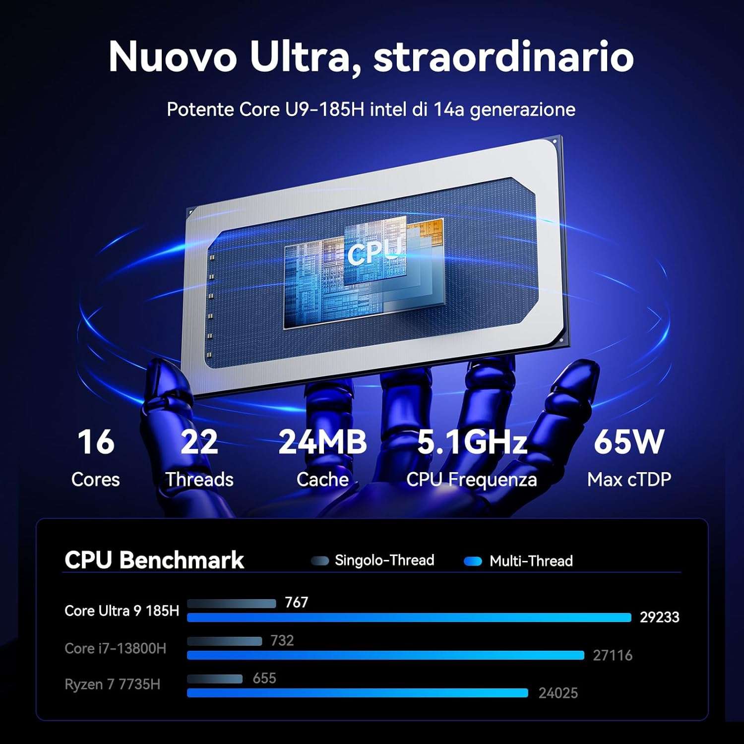 Il GEEKOM GT1 Mega è un Mini PC progettato per offrire prestazioni elevate in un formato compatto. Grazie al processore Intel Core U9-185H, garantisce un’esperienza fluida per multitasking, gaming leggero e produttività avanzata. La presenza di ben 32GB di RAM DDR5 e storage NVMe SSD da 2TB assicura velocità di risposta eccellenti, mentre la grafica integrata Intel permette una gestione efficiente dei contenuti multimediali.