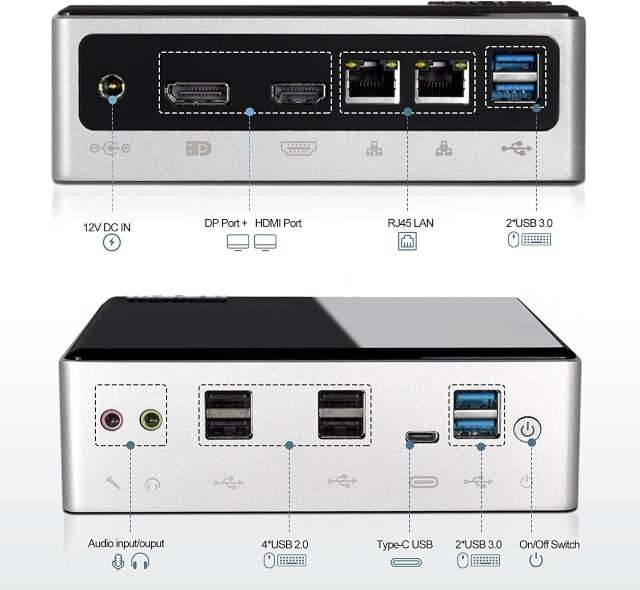 Al suo fianco trova posto una memoria RAM da 16GB espandibile fino a 64 e un SSD da 256GB, anche questo espandibile. Nonostante le dimensioni del case ultracompatte, con appena 150x137x48mm di spazio occupato, il PC è dotato di tutta la connettività che hai bisogno: porta HDMI, 2 porte RJ45 Gigabit LAN, 4 porte USB 3.0, 4 porte USB 2.0, 1 porta USB di tipo C e uscire jack per cuffie e microfono.