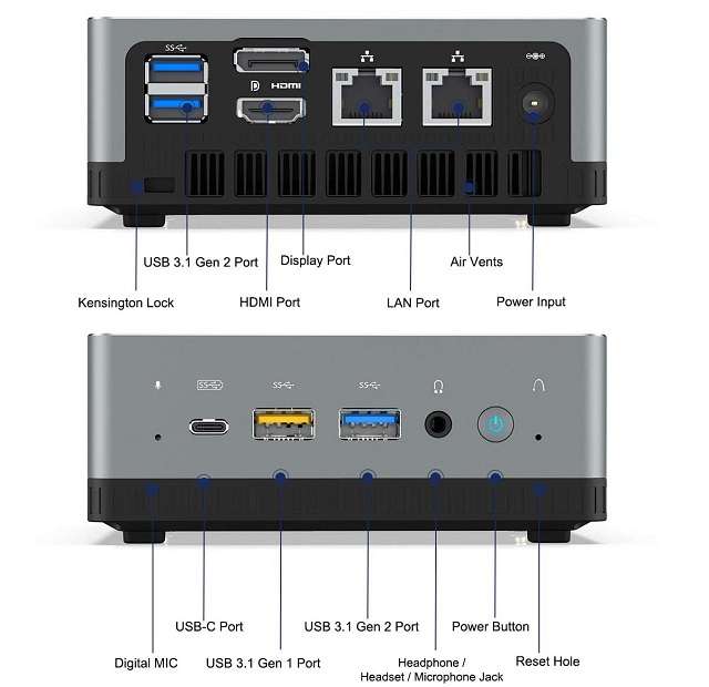 Diamo un’occhiata alle più importanti specifiche tecniche integrate: processore quad core AMD Ryzen 5 PRO 2500U, GPU Graphics Radeon Vega 8, 16 GB di RAM DDR4, unità SSD da 512 GB (M.2 2280) per lo storage (espandibile), supporto a WiFi 6 con chip Intel AX200, modulo Bluetooth 5.1, due uscite video HDMI 2.0, una Display Port e una USB-C con supporto alla risoluzione 4K, jack audio, tre porte USB 3.1 e doppio slot Ethernet. Presente Windows 10 preinstallato, ma non manca il supporto ad altri sistemi operativi come Linux.