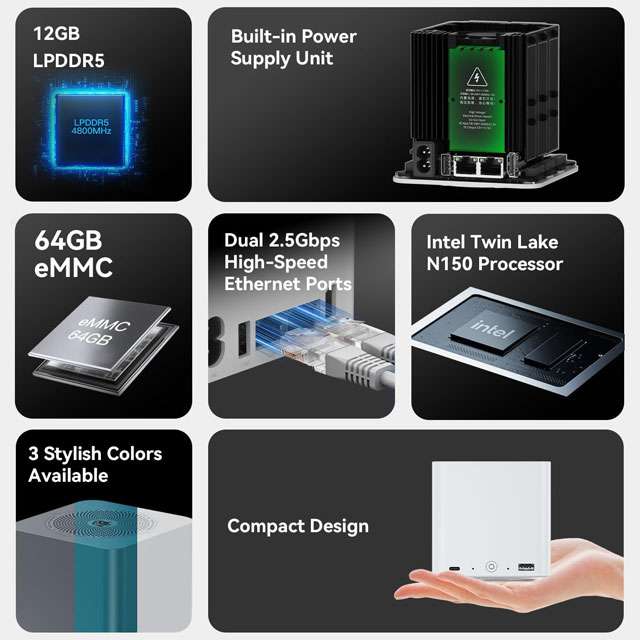 Occupa solo 9,9×9,9×9,9 centimetri e sotto la scocca nasconde il processore quad core Intel N150 di ultima generazione con chip grafico integrato, affiancato da 12 GB di RAM LPDDR5. Per quanto riguarda lo storage, sono già presenti una memoria eMMC da 64 GB e un SSD M.2 da 2 TB, ma la capacità di archiviazione può arrivare a ben 24 TB sfruttando gli slot di espansione interni. Il sistema operativo preinstallato è Windows 11 Pro. Altre caratteristiche che vale la pena citare sono il doppio slot Ethernet 2.5G, la connettività Wi-Fi 6 e Bluetooth 5.2, le porte USB 3.2 Type-A e USB-C, l’uscita video HDMI con supporto alla risoluzione 4K. Se vuoi saperne di più, dai uno sguardo alla scheda completa.