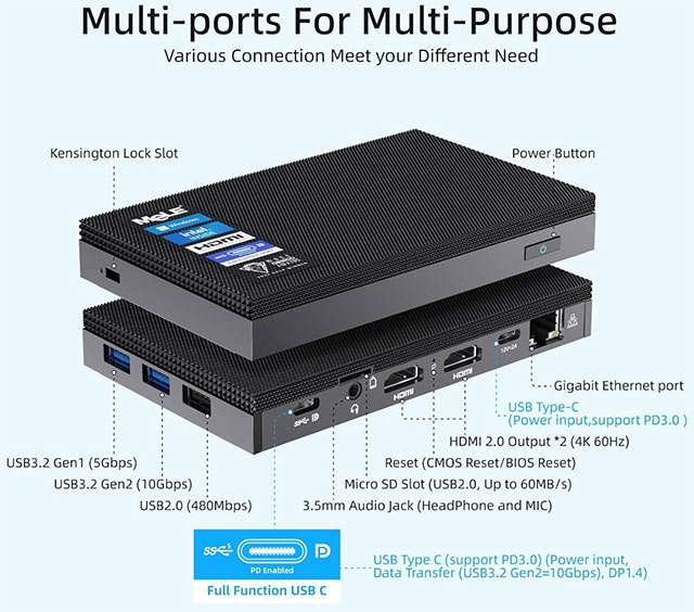 Integra il processore Intel N100 di dodicesima generazione con frequenza fino a 3,40 GHz, affiancato da 16 GB di RAM e SSD da 512 GB per lo storage. Tra le altre specifiche tecniche in dotazione ci sono la connettività Wi-Fi dual band e Bluetooth 5.1 e le porte mostrate dall’immagine qui sotto: due USB-C, tre USB-A, jack audio, slot Ethernet e doppia uscita video HDMI. Il collegamento è possibile con un massimo di tre monitor in contemporanea a risoluzione 4K. C’è anche il sistema operativo Windows 11 Pro, preinstallato e con licenza ufficiale Microsoft per ricevere tutti gli aggiornamenti rilasciati. Per altre informazioni visita la pagina dedicata.