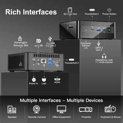 Le dimensioni sono compatte, come ben si vuole per un Mini PC, ma non mancano le porte a disposizione tra HDMI, mini DisplayPort, Thunderbolt, USB 3.2, lettore di schede SD, LAN e un jack audio per cuffie e microfono.