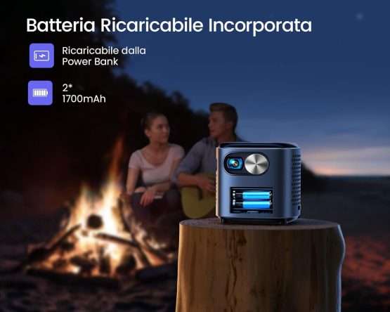 Lo usi a casa ma anche quando sei fuori perché avere un asso nella manica che non finirà mai di stupire te e amici. Questo mini proiettore portatile, infatti, ha una batteria al suo interno che ti consente di usarlo senza corrente ed avere un cinema portatile a disposizione.