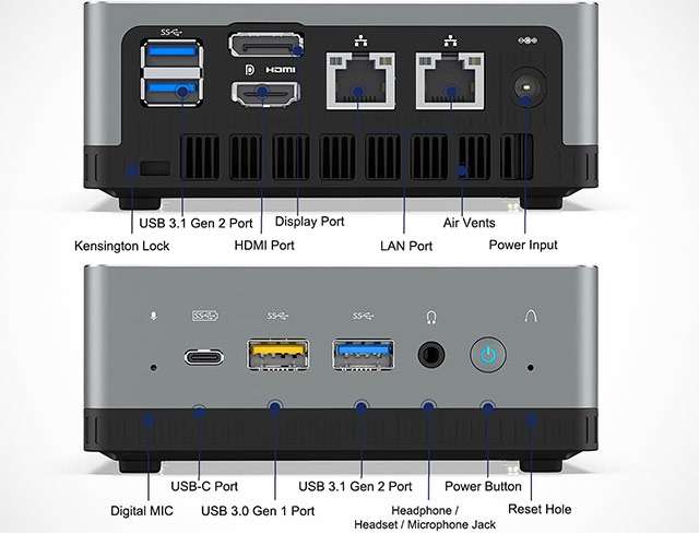 Per quanto riguarda la connettività c’è davvero tutto ciò di cui potresti avere bisogno. Le porte USB Type-A sono 4 e tutte con specifica USB 3.0 ad alta velocità per il trasferimento dati. Una di queste possiede anche la funzione di ricarica rapida per i dispositivi mobili. Due le uscite audio/video, una HDMI e l’altra DisplayPort, che insieme alla porta USB Type-C consentono di collegare fino a 3 monitor con una risoluzione massima di 4K a 60Hz. Due anche le porte RJ45 Gigabit LAN che consentono di combinare due diverse reti cablate per una velocità di trasferimento estrema. Chiudono la dotazione le immancabili connessioni wireless che offrono la velocità del Wi-Fi dual band ed il Bluetooth 5.1. In conclusione, un computer decisamente potente e versatile in grado di sostituire egregiamente un vero e proprio desktop.