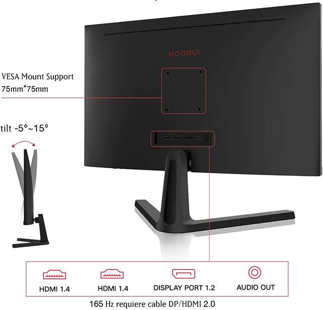 Come si può vedere nell’immagine qui sopra, può essere inclinato da -5 gradi a 15 gradi per offrire la massima comodità durante l’utilizzo. È anche compatibile con gli attacchi VESA 75×75 mm così da poterlo montare a parete o su un supporto dedicato. Non lasciarti sfuggire il forte sconto e acquista il monitor gaming modello KOORUI MG24V9F da 24 pollici al prezzo finale di soli 99 euro.