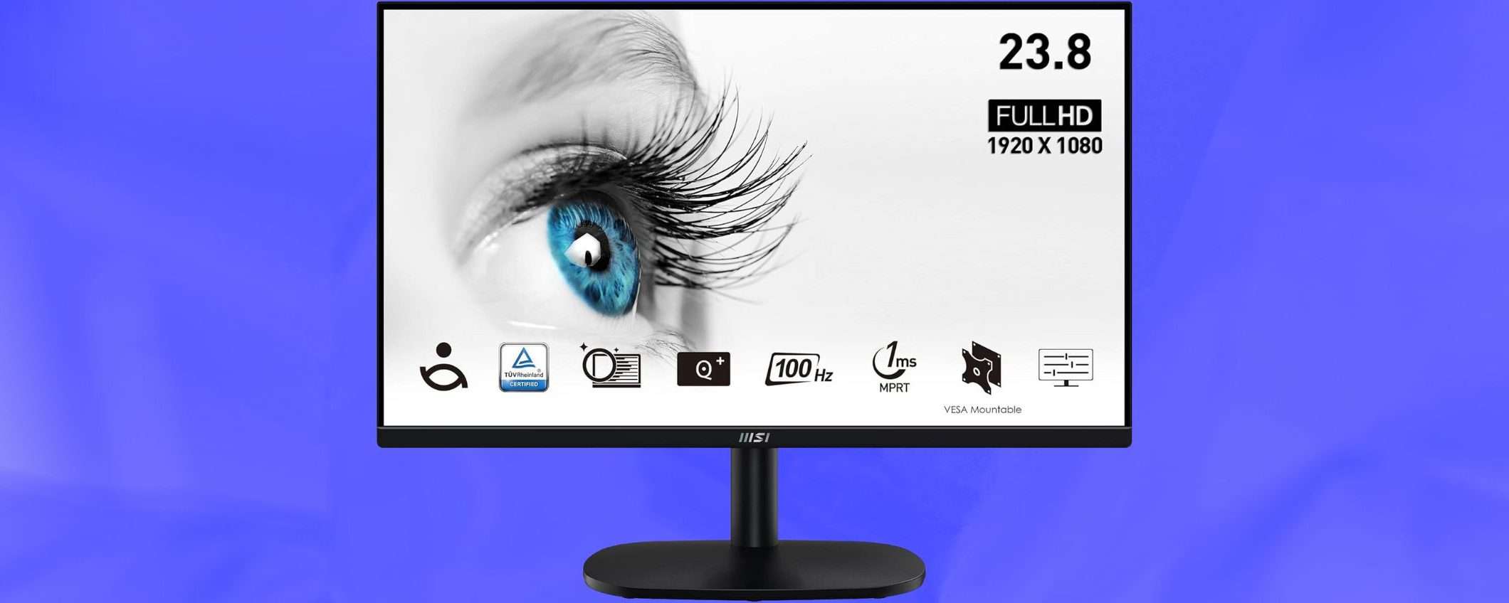 Per aggiornare la tua postazione di studio e di lavoro senza spendere troppo questa offerta a tempo su Amazon è perfetta. A soli 99,99 euro ti porti a casa il monitor MSI Pro da 23.8 pollici con risoluzione Full HD e frequenza di aggiornamento a 100Hz. Regolabile e con supporto al montaggio VESA è un bell’affare che apre questo weekend.