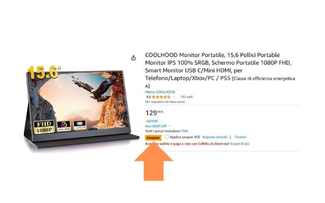 Approfitta subito di un’offerta pazzesca su Amazon! Acquista il Monitor Portatile 15″ CoolHood a soli 84,99 euro, invece di 129,99 euro. Si tratta di una super occasione che ottieni grazie al Coupon 45€ attivabile direttamente alla pagina dell’articolo prima di metterlo in carrello. Tra l’altro, se sei cliente Prime hai due vantaggi inclusi. Primo, la consegna gratuita direttamente a casa tua. Secondo, la possibilità di pagare in comode rate con Cofidis al momento del check out.