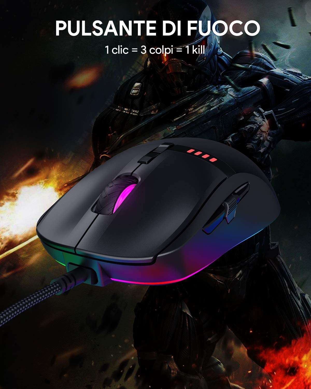 Il modello in offerta si chiama AUKEY Knight, un mouse da gaming dotato di un sensore ottico da 10000 DPI, un bel design e un’interessante illuminazione RGB. In particolare si tratta del sensore PMW3325 con polling rate a 1000Hz, una soluzione adatta ai videogiocatori più esigenti e ai titoli e-Sports.