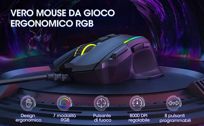 8 pulsanti programmabili e 7 modalità di illuminazione RGB