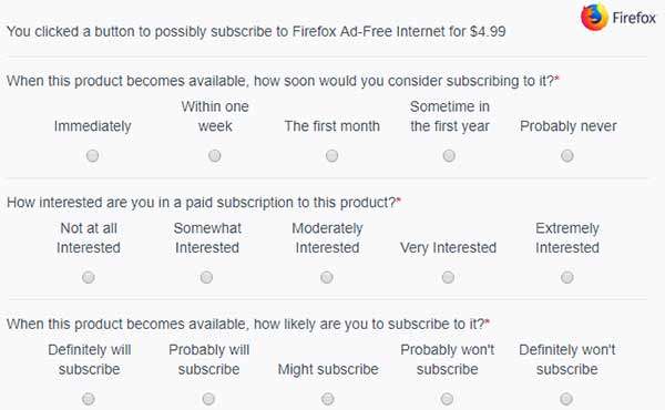Questo prodotto non è ancora disponibile, ma ci stiamo lavorando. Potresti fare click sul pulsante Next e compilare un breve questionario comunicandoci cosa ne pensi? Al termine ti chiederemo (in modo opzionale) l’indirizzo email così da farti sapere quando avverrà il lancio di Firefox Ad-free Internet in versione beta. Se non vuoi fornirci un feedback puoi andare direttamente alla pagina di registrazione.