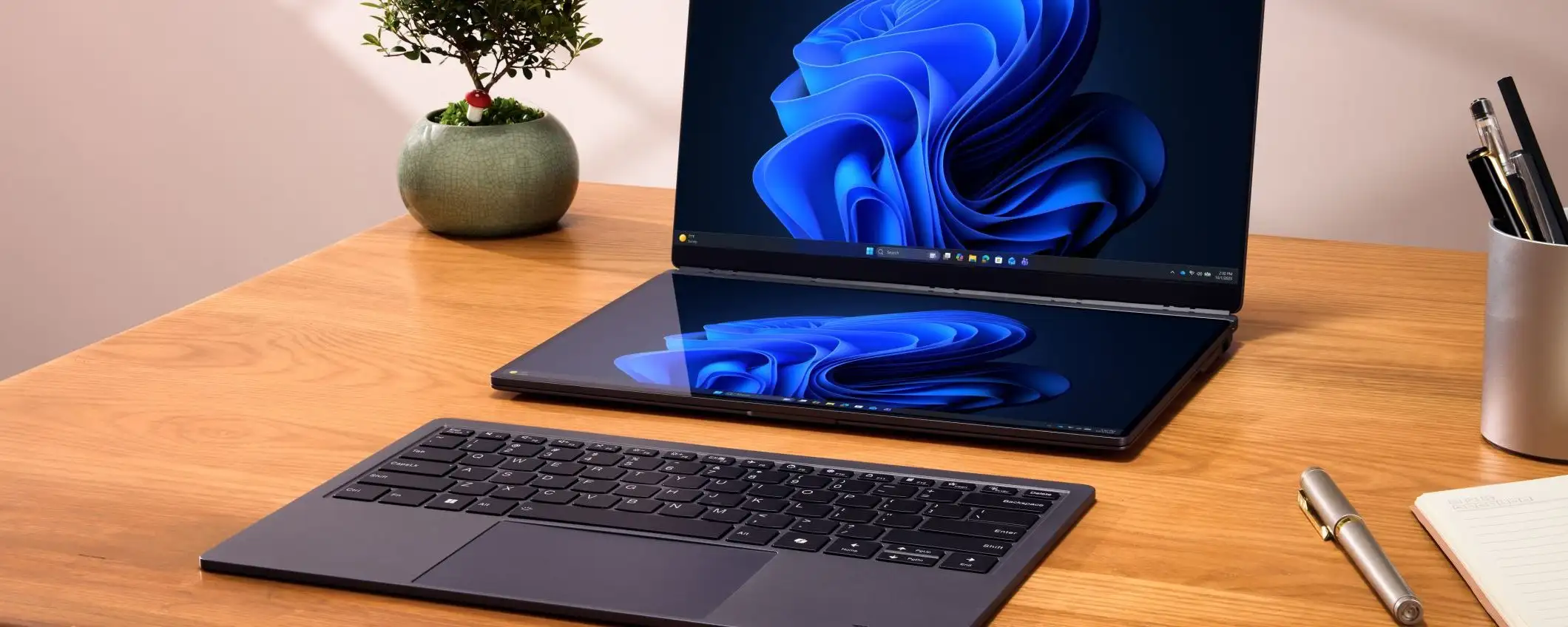 Il ThinkBook Modular AI PC Concept è un notebook con due schermi e tastiera staccabile. Oltre allo schermo principale da 14 pollici (fisso) c’è uno schermo secondario da 14 pollici che può essere collegato magneticamente alla cover oppure collegato alla porta USB Type-C e posizionato accanto al notebook su un cavalletto. Può infine sostituire la tastiera per ottenere un dispositivo dual screen.