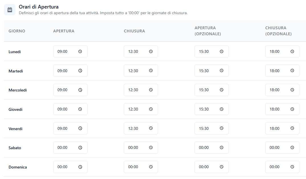 Il pannello di controllo offre funzionalità appositamente dedicate alla verifica delle aperture, compresa una sezione relativa all’apertura settimanale che permette di configurare gli orari in base ai giorni della settimana.