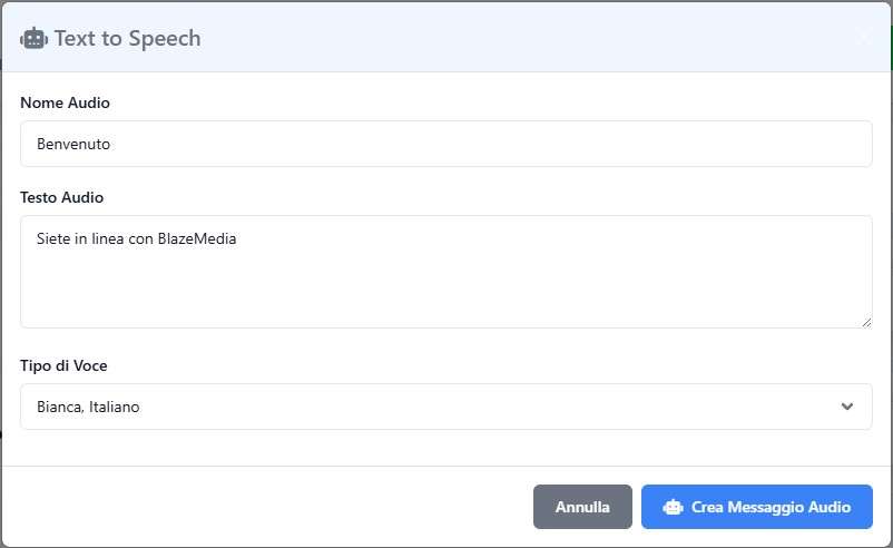 Una volta definiti gli orari è possibile selezionare un file audio da riprodurre quando l’attività è chiusa, per poi stabilire l’azione da eseguire quando si verifica, appunto, la condizione di chiusura, come per esempio l’inoltro ad un servizio interno. La creazione del file audio è altrettanto semplice: dal percorso “Audio > Messaggi audio” si può caricare un file MP3 o cliccare su “Crea Audio”. Se si sceglie la seconda opzione basta indicare un nome per l’audio, definire un testo e scegliere il tipo di voce da associare ad esso.