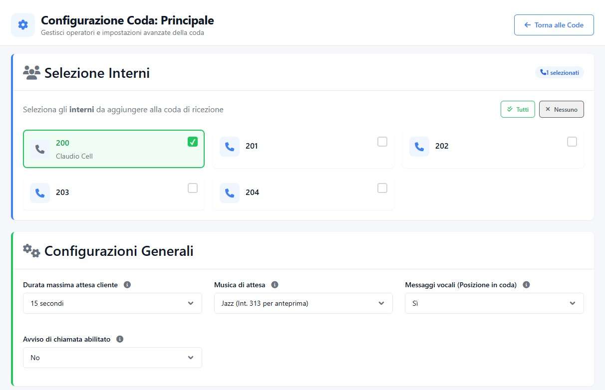 Chiaramente è possibile gestire anche la coda delle chiamate definendo più tipologie di code. Il servizio consente infatti di selezionare gli interni da aggiungere alla coda di ricezione e di stabilire la durata massima di attesa del cliente (ad esempio: 15 secondi), la musica da riprodurre durante l’attesa, l’eventuale messaggio vocale e l’abilitazione o meno dell’avviso di chiamata.
