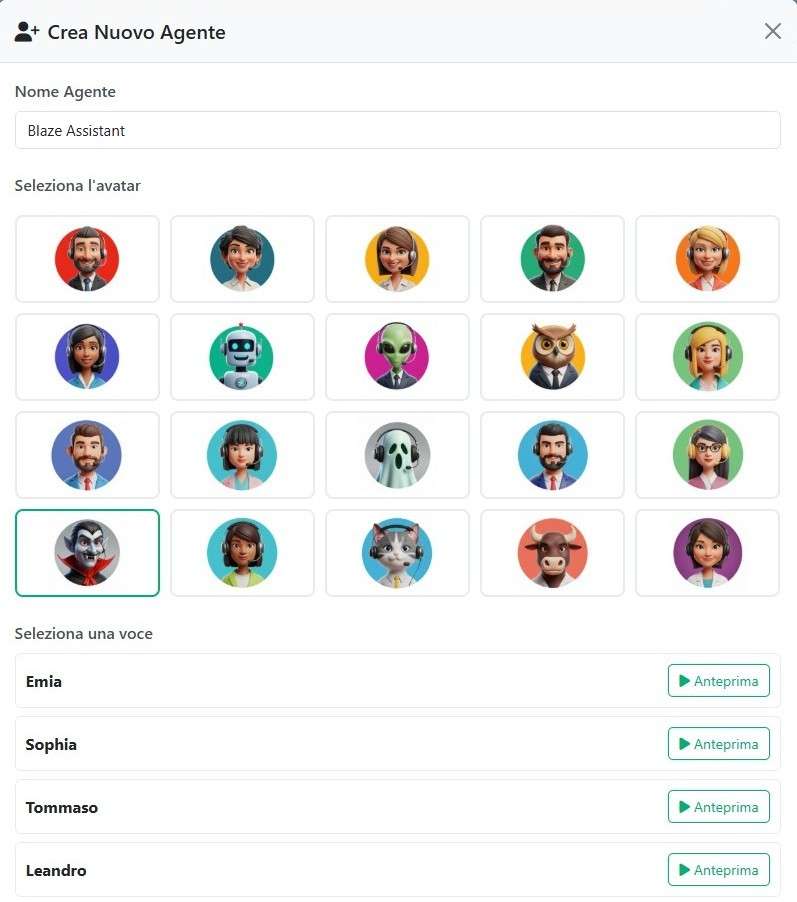 Anche in questo caso il pannello di controllo ci mette a disposizione una sezione dedicata. Seguendo il percorso “Intelligenza Artificiale > Gestione Agenti > Nuovo Agente” è possibile scegliere un nome da associare ad esso, un avatar per impersonificarlo e la voce con cui parlerà agli utenti (con tanto di anteprima).