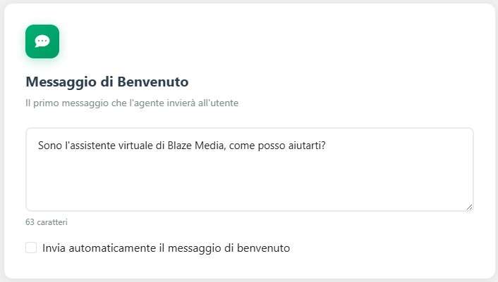 Dopo aver creato l’Agente AI lo si può configurare tramite una procedura di fine-tuning con la quale adattarlo nel miglior modo possibile al compito che deve svolgere. MyCentralino consente innanzitutto di definire un messaggio di benvenuto, cioè il primo messaggio che l’agente invierà all’utente, e di decidere se dovrà essere inviato automaticamente o meno.