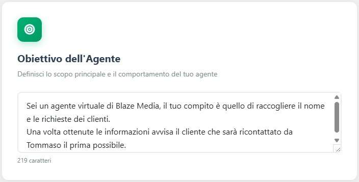 Ma è ancora più interessante la possibilità di stabilire l’obiettivo dell’Agente, cioè lo scopo per il quale è stato creato e quale dovrà essere il suo comportamento durante l’interazione con l’utenza. Il prompt consente di dare indicazioni precise, tali da poter istruire l’agente stesso affinché conduca la discussione con la controparte in modo finalizzato, portando lo scambio ad un risultato.