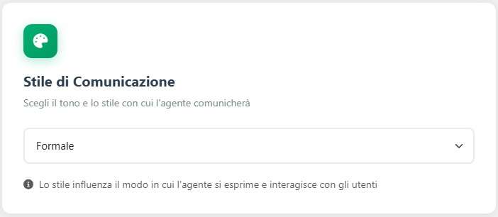 Si può poi impostare uno stile di comunicazione che può essere, ad esempio, formale o informale, professionale o amichevole, empatico, tecnico e così via. Si tratta di un passaggio da non sottovalutare, in quanto il tono scelto ha un’influenza diretta sul modo in cui l’Agente comunica con gli utenti. Il robot diventa interfaccia della propria organizzazione, motivo per cui è importante allinearne lo stile.