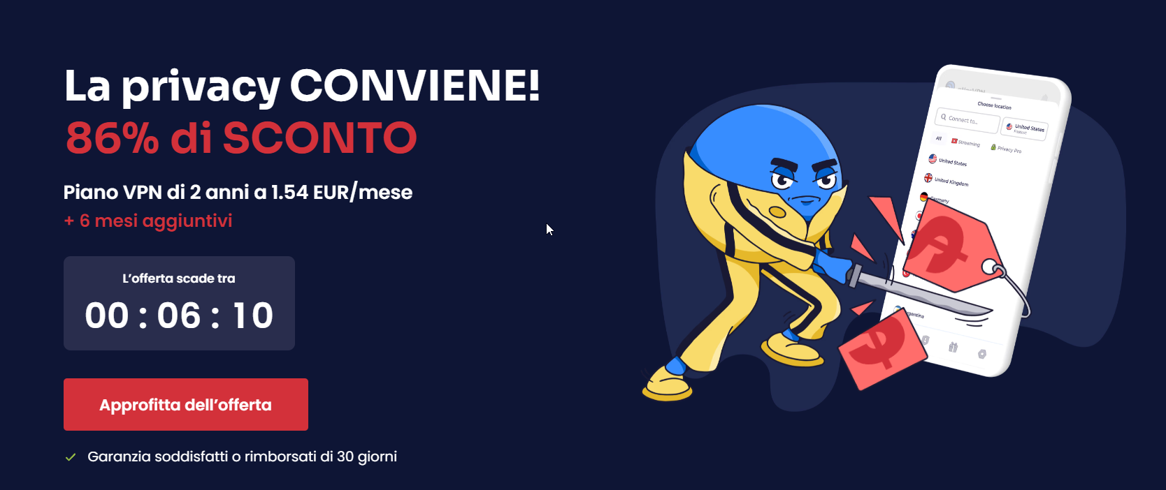 Questa VPN trasforma la sicurezza e la privacy in due fortini inespugnabili, che puoi rendere tali pagando l’86% in meno. Se scegli il piano biennale, pagherai soltanto 1,54 euro al mese e avrai una connessione sicura e sei mesi di servizio aggiuntivi GRATUITI.