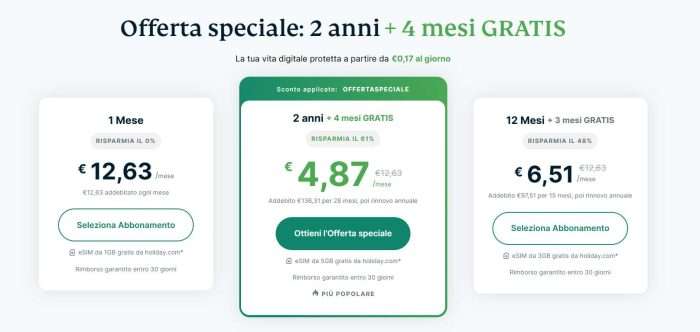 Un’offerta che ti regala anche 4 mesi di servizio gratis, più tutta una serie di funzionalità per tutelare la tua privacy online su qualsiasi dispositivo: PC, Mac, iPhone, Android e altro ancora. Paura di non essere soddisfatto? Nessun problema: c’è sempre la garanzia di rimborso di 30 giorni per riavere indietro i soldi spesi.