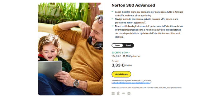 Acquistarlo adesso significa risparmiare il 70% sul costo originario nel primo anno: bastano 3,33€ al mese. Per approfittarne vai sul sito di Norton.