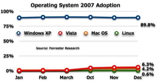 La perdita di quasi quattro punti è da imputare in primo luogo ai sistemi operativi Apple : alla fine del 2007 erano installati sul 4,2 per cento delle macchine aziendali, guadagnando il 3 per cento del mercato. Apple entusiasma soprattutto le aziende più piccole, avverte l’autore della ricerca, mentre i dipartimenti IT delle grandi imprese sembrano indissolubilmente legati a Windows. Qualcosa si è mosso anche sul fronte dei sistemi operativi Linux desktop: se all’inizio del 2007 detenevano il solo 0,1 per cento della quota di mercato business, alla fine di dicembre si erano insediati sullo 0,6 per cento del parco macchine.