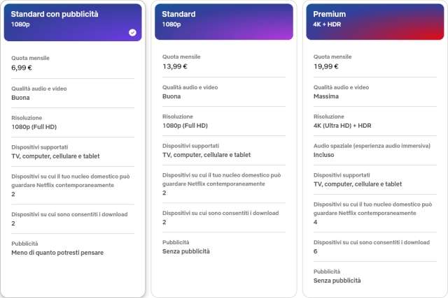 Nonostante questi dati molto positivi, Netflix ha deciso di aumentare i prezzi in Italia e Spagna. A partire da oggi, il piano Standard con pubblicità aumenta da 5,49 euro/mese a 6,99 euro/mese. Il piano Standard passa da 12,99 euro/mese a 13,99 euro/mese. Infine, il piano Premium aumenta da 17,99 euro/mese a 19,99 euro/mese. Per ogni utente extra (1 per Standard, 2 per Premium) si deve aggiungere 4,99 euro/mese.