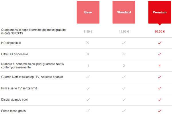 8,99 euro (anziché 7,99 euro) per la formula Base che permette di guardare film e serie TV su un solo schermo, 12,99 euro (invece di 10,99 euro) per quella Standard che consente l’accesso allo streaming di due dispositivi in contemporanea e 16,99 euro (ora è 13,99 euro) per l’opzione Premium che oltre a garantire la visione simultanea su quattro terminali differenti abilità il supporto al formato Ultra HD. In base alla tipologia di account, dunque, gli aumenti sarebbero rispettivamente di 1, 2 e 3 euro. Il tutto è riassunto nella tabella seguente, catturata in uno screenshot semplicemente accedendo a Netflix senza effettuare il login.