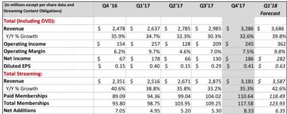 Il quarto trimestre del 2017 per Netflix è stato brindato con successo. Il servizio di video streaming è riuscito ad attirare a sé la bellezza di 8,3 milioni di nuovi utenti (di cui 1,98 milioni negli Stati Uniti). I numeri hanno battuto le previsioni degli analisti, che si fermavano a un più moderato 6,3 milioni, decretando il successo delle iniziative dell’azienda e i recenti sforzi commerciali. Nelle immediate ore successive alla notizia Il valore delle azioni sono schizzate a + 9 per cento per poi stabilizzarsi ad un + 3 per cento e garantendo una capitalizzazione di oltre 100 miliardi di dollari . L’azienda ovviamente ha espresso soddisfazione: “Abbiamo avuto un ottimo quarto trimestre, completando un anno eccezionale per la Internet TV che si espande a livello globale”.