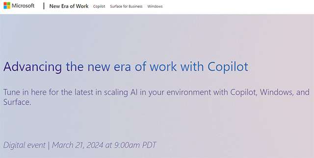 Sono emersi nuovi dettagli a proposito di New Era of Work, l’evento organizzato da Microsoft e che andrà in scena giovedì 21 marzo. È online la pagina dedicata all’appuntamento, dal sottotitolo Avanzando nella nuova era del lavoro con Copilot