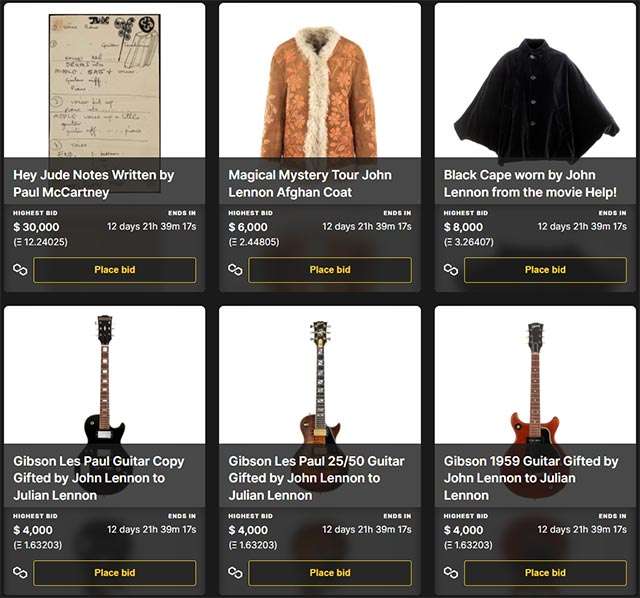 Collegandosi alle pagine del sito dedicato è già oggi possibile fare la propria offerta per aggiudicarsi alcuni asset come la giacca o il mantello indossati nei film Magical Mystery Tour e Help, una nota scritta a mano da Paul McCartney durante la composizione di Hey Jude e tre chitarre Gibson. In un caso i rilanci sono già arrivati a toccare l’equivalente di 30.000 dollari.