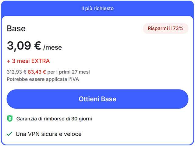 Scegli la formula che preferisci tra Base, Plus e Ultimate. Ognuna è composta da diverse caratteristiche: la più completa include anche la protezione anti-malware per tenere lontani i virus, il blocco delle pubblicità e del tracciamento online, un password manager con breach scanner per ricevere avvisi immediati in caso di violazione e 1 TB di spazio sul cloud per l’archiviazione sicura dei file. Scopri di più nella pagina dedicata.