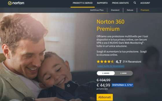 Il costo del piano Norton 360 Premium è in realtà abbastanza conveniente. Grazie allo sconto del 59%, puoi acquistare questo piano per soli 44,99 euro invece del prezzo originale di 109,99 euro.