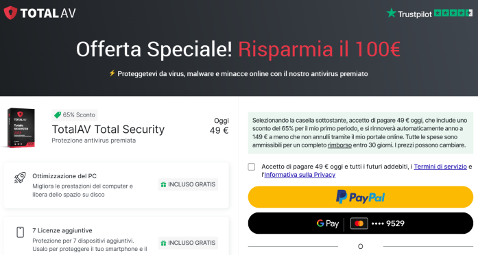 Il tutto ora ad un prezzo di 49€ per un anno invece di 149€: il risparmio netto è di 100€. Per approfittare di questa promo basta andare sul sito di TotalAV. Questo software è compatibile con i principali sistemi operativi e può essere utilizzato fino ad un massimo di 8 dispositivi.