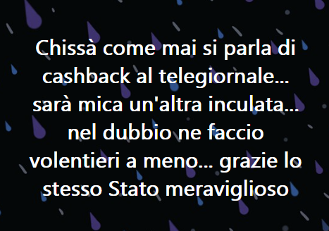 Vede, per tutti gli acquisti fatti con bancomat o carta di credito dall’8 al 31 dicembre vi valutano il 10% della spesa come cashback per un totale massimo di 150.00€ . Ve li riaccreditano a febbraio. Non sapete però, che il rimborso massimo è di 15.00€ a transazione. Che voi spendiate quindi 1500.00€ o 150.00€ il rimborso sarà sempre 15.00€. Che nel caso di 1500.00€ non è il 10%. Bensì l’1%. Gli acquisti on-line non valgono, alcune carte di credito non valgono e per accedere al programma dovrete fare minimo 10 acquisti. Il che si traduce che per ottenere i famosi 150.00€ massimi di bonifico, dovrete spendere 1500.00€ in dieci transazioni da 150.00€ l’una.