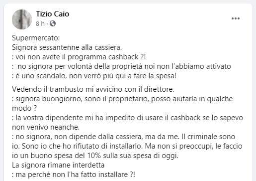 Come si può essere contrari al cashback pensando che sia tutta una grossa montatura che toglie denaro “al popolo”? Come può, un programma che elargisce denaro per distribuire potere di spesa, essere visto come un ostacolo? Ecco un esempio, uno su molti: