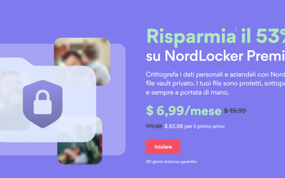 Non a caso, la piattaforma di archiviazione NordLocker ti offre la possibilità di archiviare, gestire e accedere ai tuoi file ovunque tu sia ma anche di condividere i dati in modo sicuro con chiunque tu voglia. La sincronizzazione dei file, inoltre, può essere effettuata su tutti i tuoi dispositivi. Se vuoi proteggere i tuoi dati da criminali informatici oggi puoi farlo approfittando di uno sconto del 53%: il piano annuale di 2TB costa solamente 6,99 euro al mese con 30 giorni di rimborso garantito nel caso in cui tu non sia soddisfatto.