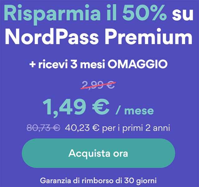 Ricapitolando, oggi puoi attivare l’abbonamento biennale a NordPass approfittando di uno sconto del 50% sul listino e ottenendo 3 mesi gratis. Tutto questo al prezzo mensile di soli 1,49 euro, una spesa davvero contenuta se si considera l’affidabilità del servizio e le sue tante caratteristiche.
