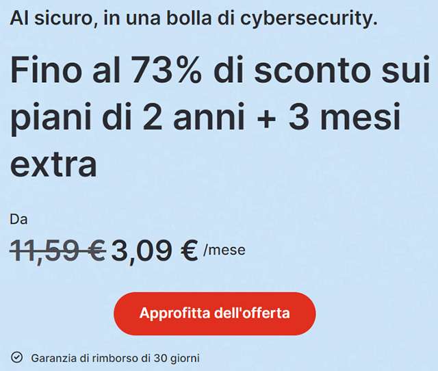 Ricapitolando, al prezzo mensile di soli 3,09 euro (invece di 11,59 euro come da listino) puoi ottenere la sottoscrizione biennale alla Virtual Private Network di NordVPN, grazie allo sconto del 73% disponibile in questo momento. Inoltre, la promozione attuale include 3 mesi extra gratis, in aggiunta ai 24 inclusi nel pacchetto.