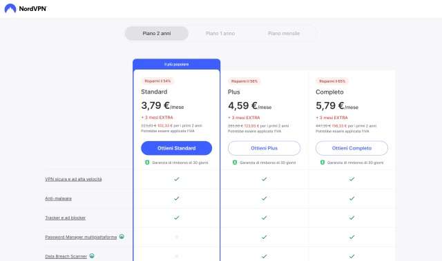 Lo sconto più alto è sul piano Completo, in offerta a 5,79 euro al mese per 24 mesi. C’è poi il piano Plus a 4,59 euro al mese per i primi 2 anni, per effetto del 56% di sconto. Infine NordVPN Standard, il piano più popolare, in offerta a 3,79 euro al mese con lo sconto del 54%.