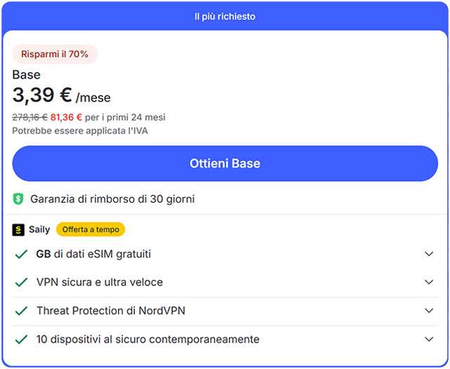 Si tratta di un’offerta a tempo e che potrebbe dunque scadere da un momento all’altro: se sei interessato ti consigliamo di approfittarne subito. Non lasciarti sfuggire l’occasione, attivala ora e ottieni uno sconto fino al 72% sull’abbonamento biennale a NordVPN, in aggiunta a 10 GB di traffico gratis per la eSIM.
