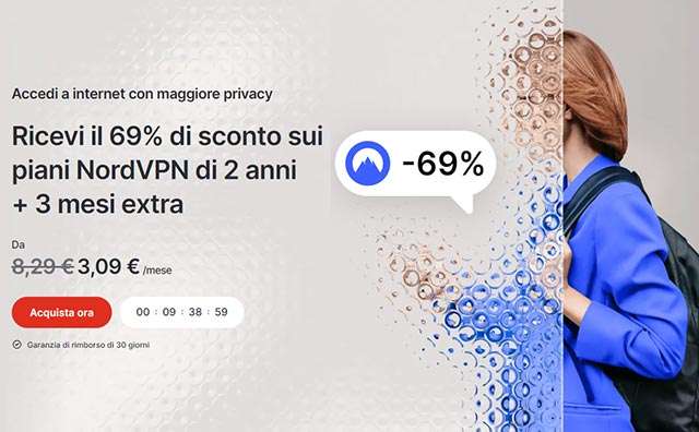 Ancora per poco tempo, puoi approfittare della nuova offerta speciale di NordVPN e attivare un abbonamento al servizio con uno sconto fino al 69%. Avrai così a disposizione tutto ciò di cui necessiti per navigare in modo anonimo e per proteggere la tua privacy durante ogni attività online.