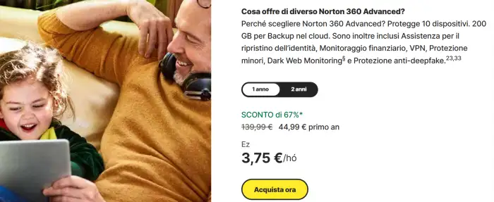 Con Norton 360 Advanced, invece, è possibile unire entrambe le protezioni in un unico abbonamento, approfittando di un prezzo promozionale di 3,75 euro al mese sul piano annuale, grazie a uno sconto del 67%. Una proposta davvero interessante, considerando che molti servizi VPN e antivirus, presi singolarmente, hanno costi superiori.