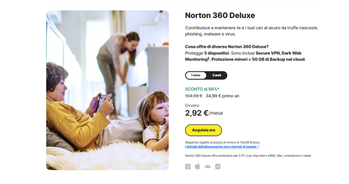 L’offerta promozionale su Norton 360 Deluxe è disponibile per un tempo limitato, ed è un’opportunità da cogliere per chi vuole migliorare la propria sicurezza online senza spendere troppo. Dopo i primi 12 mesi, il piano si rinnova automaticamente a 104,99€ all’anno, salvo disdetta anticipata.