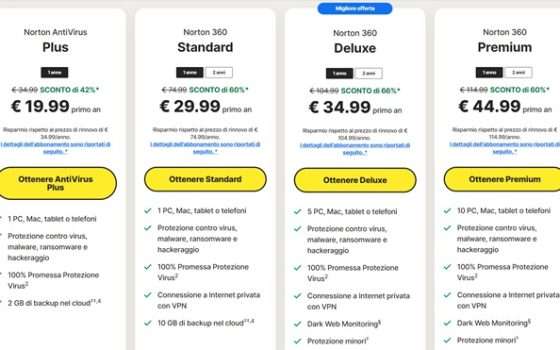 Oltre agli abbonamenti sopra citati, come Norton Antivirus Plus e Norton 360 Premium, non mancano altre soluzioni come Norton 360 Deluxe o Norton 360 Standard. Quest’ultimo, infatti, può essere tuo pagando solamente 29,99 euro per il primo anno grazie ad uno sconto del 60%. Con una cifra del tutto minima, dunque, puoi avere a portata di click uno strumento in grado di assicurare protezione contro virus, malware, ransomware e hackeraggio. A rendere il tutto ulteriormente conveniente, la possibilità di utilizzare una connessione a Internet privata con VPN inclusa nel prezzo e 10 GB di backup nel cloud.