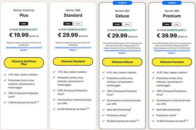I prezzi sono riferiti all’abbonamento annuale. Per l’elenco completo delle caratteristiche incluse e per tutti i dettagli in merito ai dispositivi compatibili rimandiamo alla pagina dedicata.
