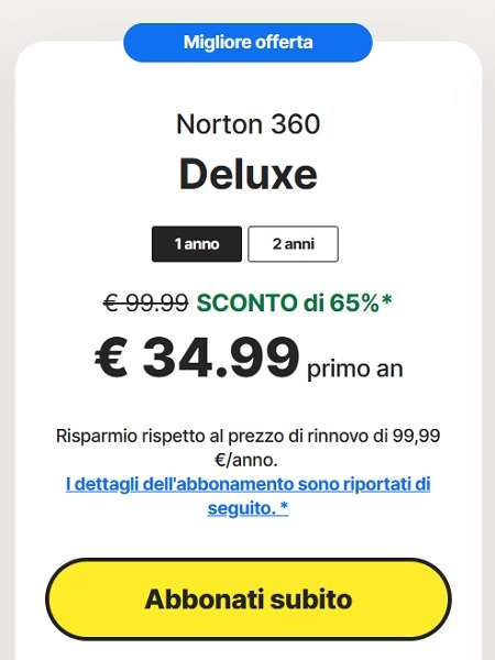 In queste ore è disponibile tramite questo link dedicato la miglior offerta per il piano Norton 360 Deluxe: paghi soli 34,99 per i primi 12 mesi, rispetto ai 99,99 euro di listino, per effetto del 65% di sconto. L’offerta è a tempo limitato, potrebbe terminare tra poco.