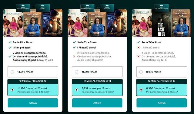C’è poi l’opzione Premium al prezzo di 11,99 euro al mese per 12 mesi anziché 14,99 euro al mese, che oltre ai pass Entertainment e Cinema aggiunge l’on demand senza pubblicità, l’audio Dolby Digital 5.1 e 2 visioni in contemporanea.