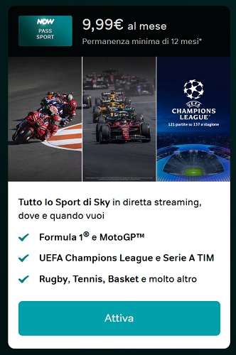 In queste ore i nuovi clienti NOW possono sottoscrivere l’abbonamento al Pass Sport al costo di 9,99 euro al mese per dodici mesi, con un tempo di permanenza minimo della durata di un anno. Il Pass Sport include tutto lo sport di Sky in diretta streaming e on demand, comprese le gare di Formula 1 e MotoGP, i match di Champions League e Serie A TIM, oltre al rugby, il tennis e il basket e tanto altro ancora.